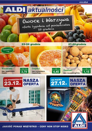 {loadposition linkAldi} Nowa gazetka promocyjna Aldi. Polecane promocje z gazetki Aldi: Rajstopy damskie glamour - 13,99 zł. Kapcie damskie baleriny - 17,99 zł. Stół do masażu - 399 zł. Oferta ważna od 23.12 do wyczerpania zapasów.