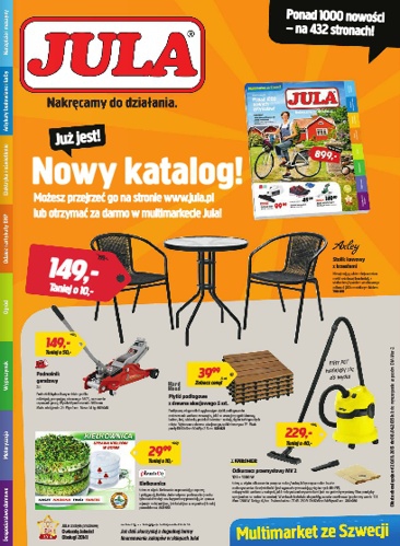 {loadposition linkJulaK} Katalog wiosenny 2017 sieci handlowej Jula. Polecane promocje z katalogu Jula: Stolik kawowy z krzesłami - 199 zł. Pilarka ukosowa Meec 2100 W - 499 zł. Olej do drewna Hard Head 3 L - 24,99 zł. …