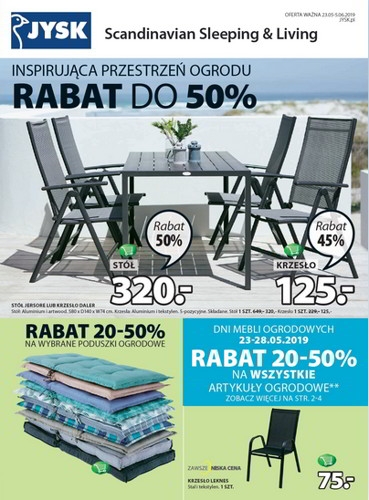 'Inspirująca przestrzeń ogordu' - nowa gazetka promocyjna sieci sklepów JYSK. Polecane promocje z gazetki Jysk: Rabat 20-50% na wybrane poduszki ogrodowe. Rabat 20-50% na wszystkie artykuły ogrodowe*. Rabat 20-40% na szeroki wybór stolików kawowych. *…