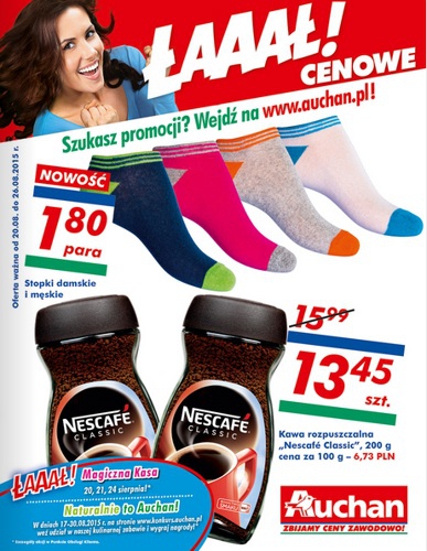 {loadposition linkAuchan} Nowa gazetka promocyjna Auchan - "Łaaał! Cenowe". Polecane promocje z gazetki Auchan: Stopki damskie lub męskie - 1,80 zł. Kawa rozpuszczalna Nescafe Classic 200 g - 13,45 zł. Słonecznik 2 sztuki - 3 zł. Oferta ważna…