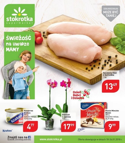 Nowa gazetka promocyjna sieci sklepów Stokrotka -"Jakość na uwadze mamy". Polecane promocje z gazetki Stokrotka: Soczysty filet z kurczaka 1 kg - 13,49 zł. Konserwa Krakus 300 g - 4,77 zł. Storczyk 1-pędowy - 17,99 zł.…