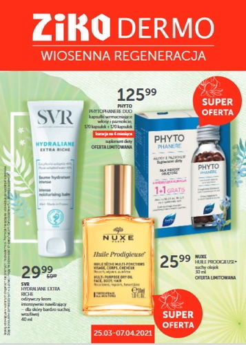 'Wiosenna regeneracja' - nowa gazetka promocyjna drogerii Ziko Dermo. Polecane promocje z gazetki Ziko Dermo: Kapsułki wzmacniające włosy i paznokcie Phyto Phytophanere Duo 240 kapsułek - 125,99 zł. Odżywczy krem intensywnie nawilżający dla skóry bardzo suchej i wrażliwej SVR…