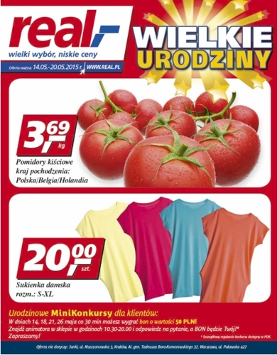 Nowa gazetka promocyjna sieci handlowej Real - "Wielkie urodziny". Polecane promocje z gazetki Real: Pomidory kiściowe 1 kg - 3,69 zł. Sukienka damska - 20 zł. Szampon Palmolive 2x350 ml - 8 zł. Oferta ważna od 14.05…