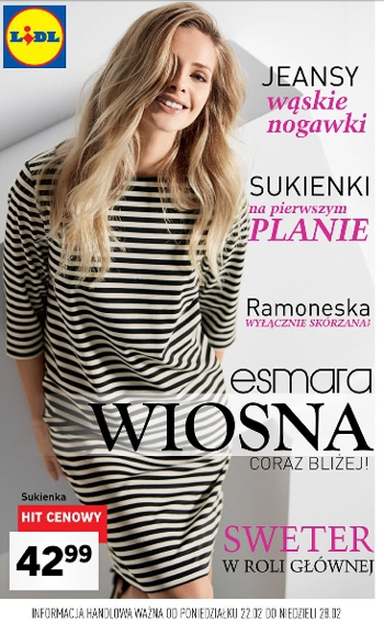 Nowa gazetka promocyjna Lidl - "Wiosna coraz bliżej". Polecane promocje z gazetki Lidl: Sukienka damska - 42,99 zł. Buty damskie - 59,90 zł. Jeansy damskie - 39,99 zł. Gazetka promocyjna Lidla obowiązuje od 22.02 do 28.02 lub do…