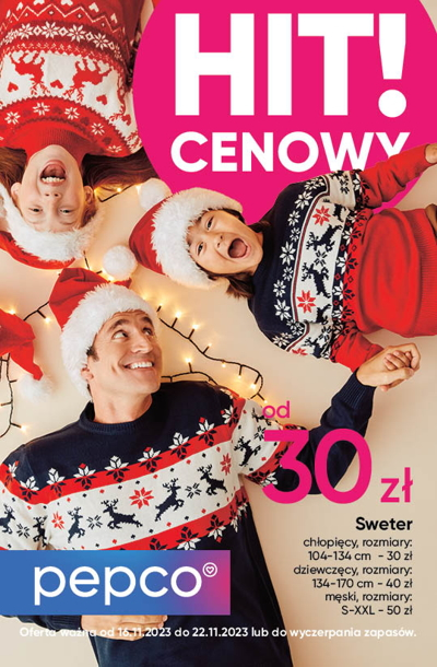 'Świąteczne swetry' - najnowsza gazetka promocyjna sieci sklepów Pepco. Polecane promocje z gazetki Pepco: Sweter świąteczny - od 30 zł. Sweter świąteczny niemowlęcy - 25 zł. Sweter świąteczny dla psa - 25 zł. Oferta ważna od czwartku…