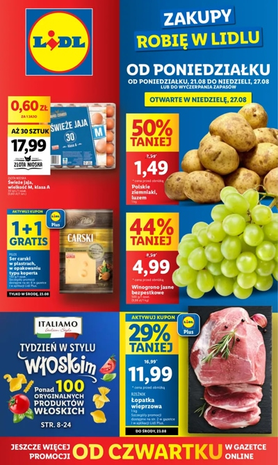 {loadposition linkLidl1} 'Od poniedziałku' - nowa gazetka promocyjna sieci sklepów Lidl. Polecane promocje z gazetki sklepów Lidl: Polskie ziemniaki 1 kg - 1,49 zł. Winogrono jasne bezpestkowe 1 kg - 4,99 zł. Świeże jaja Złota Nioska klasa M 30…