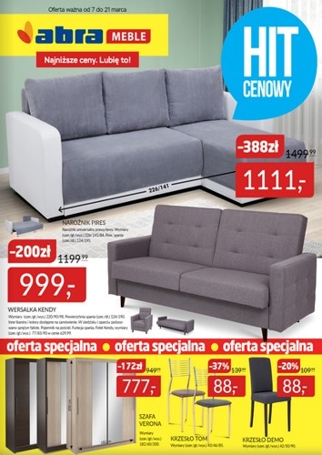 {loadposition linkAbra} Nowa oferta promocyjna sieci sklepów Abra Meble. Polecane promocje z gazetki Abra Meble: Narożnik PIRES - 1111 zł. Wersalka KENDY - 999 zł. Szafa VERONA - 777 zł. Oferta ważna od czwartku 7.03…