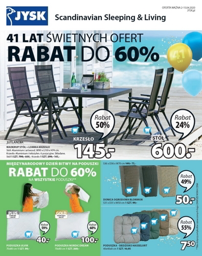 '41 lat świetnych ofert' - nowa gazetka promocyjna sieci sklepów JYSK. Polecane promocje z gazetki Jysk: Rabat 20-40% na wybrane szafy. Rabat 20-60% na wybrane koce. Rabat 20-50% na wybrane fotele. Oferta ważna od…