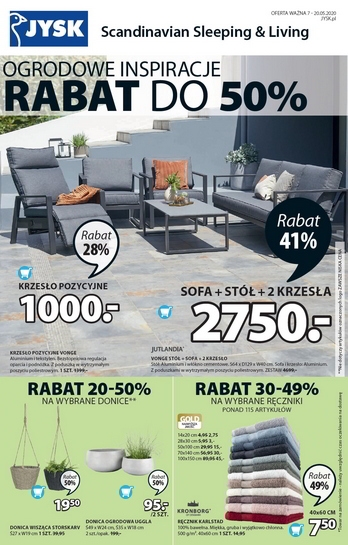 'Ogrodowe inspiracje' - nowa gazetka promocyjna sieci sklepów JYSK. Polecane promocje z gazetki Jysk: Rabat 20-50% na wybrane donice. Rabat 30-49% na wybrane ręczniki. Rabat 20-40% na wybrane szafy. Oferta ważna od czwartku 7.05…