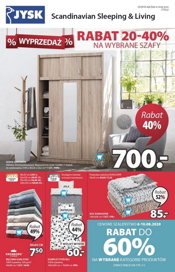 'Wyprzedaż' - nowa gazetka promocyjna sieci sklepów JYSK. Polecane promocje z gazetki Jysk: Rabat 20-40% na wybrane szafy. Rabat 30-49% na wybrane ręczniki. Rabat do 60% na wybrane poduszki. Oferta ważna od czwartku 6.08…