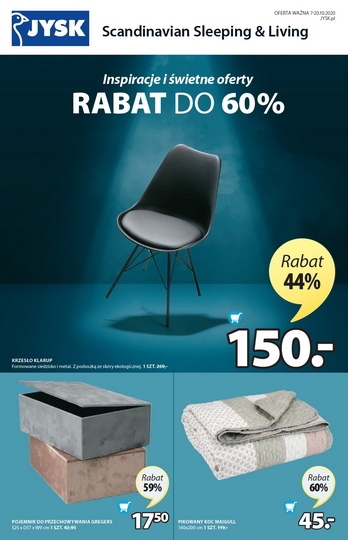 Inspiracje i świetne oferty. Rabat do 60%' - nowa gazetka promocyjna sieci sklepów JYSK. Polecane promocje z gazetki Jysk: Rabat 20-40% na szeroki wybór kanap. Rabat 20-49% na szeroki wybór szaf. Rabat 30-49% na wszystkie firany. Oferta…