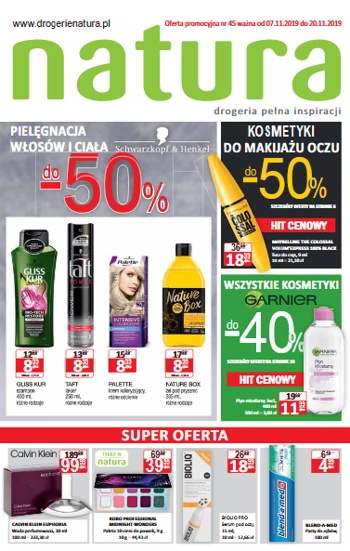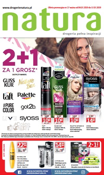 {loadposition linkNatura} '2+1 za 1 grosz' - nowa gazetka promocyjna Drogerii Natura. Polecane promocje z gazetki Drogerii Natura: Lakier do włosów Taft 250 ml - 10,99 zł. Szampon do włosów Gliss Kur 400 ml - 10,49 zł. Krem koloryzujący…