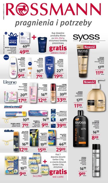 Nowa gazetka promocyjna drogerii Rossmann - "Pragnienia i potrzeby". Polecane promocje z gazetki Rossmann: Szampon do włosów SYOSS 500 ml - 8,69 zł. Maszynka Gillette Mach 3 - 15,99 zł. Żel pod prysznic Nivea 500 ml - 9,49 zł.…