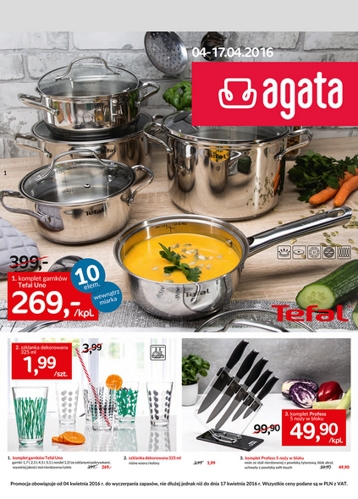 {loadposition linkAgata} Nowa gazetka promocyjna Agata Meble. Polecane promocje z gazetki Agata Meble: Komplet garnków Tefal Uno - 269 zł. Komplet 5 noży w bloku Profess - 49,90 zł. Szklanka dekorowana 325 ml - 1,99 zł. Oferta ważna…