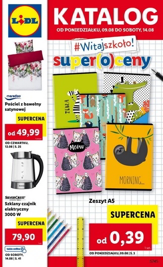 {loadposition linkLidl} Nowa gazetka promocyjna sieci sklepów Lidl. Polecane promocje z gazetki sklepów Lidl: Zeszyt A5 - od 0,39 zł. Pościel z bawełny satynowej Meradiso - od 49,99 zł. Szklany czajnik elektryczny SilverCrest 3000 W - 79,90 zł. …