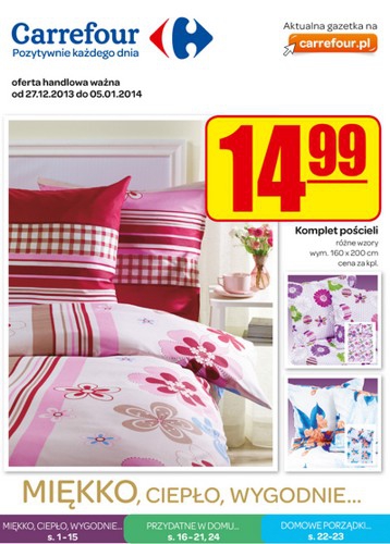 {loadposition linkCarrefour} Nowa gazetka promocyjna sieci handlowej Carrefour - "Miękko, ciepło, wygodnie...". Polecane promocje z gazetki Carrefour: Komplet pościeli - 14,99 zł. Poduszka wym. 40x40 cm - 7,99 zł. Szlafrok damski lub męski - 26,99 zł. Oferta ważna…