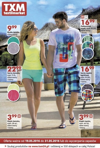 {loadposition linkTXM} Nowa gazetka promocyjna Textil Market. Polecane promocje z gazetki Textil Market: Bluzka damska - 12,99 zł. Szorty damskie - 17,99 zł. Plecak - 39,99 zł. Oferta ważna od 2.06 do 14.06 lub do wyczerpania zapasów.