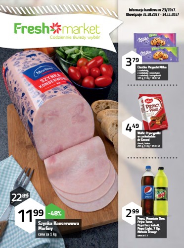 {loadposition linkFreshmarket} Nowa gazetka promocyjna sieci sklepów Freshmarket. Polecane promocje z gazetki Freshmarket: Szynka Konserwowa Morliny 1 kg - 11,99 zł. Ciastka Pieguski Milka 135 g - 3,79 zł. Wafle Pryncypałki w czekoladzie dr Gerard 235 g…