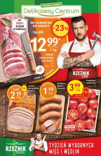 {loadposition linkDelikatesyCentrum} 'Tydzień wybornych mięs i wędlin' - nowa gazetka promocyjna Delikatesów Centrum. Polecane promocje z gazetki Delikatesów Centrum: Schab wieprzowy bez kości 1 kg - 12,99 zł*. Kiełbasa śląska Olewnik - 1,19 zł**. Szynka Staropolska Mazury 100 g…