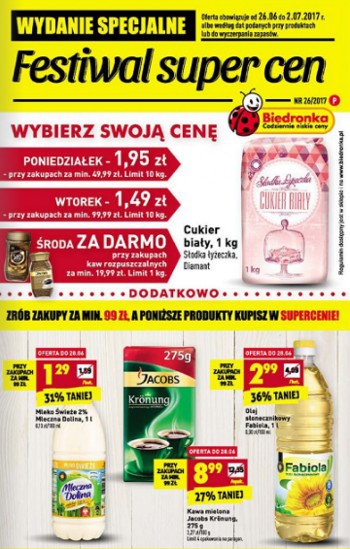 {loadposition linkBiedronka2} Nowa gazetka promocyjna sieci sklepów Biedronka - "Festiwal super cen". Polecane promocje z gazetki sieci Biedronka: Szynka wieprzowa bez kości pakowana próżniowo Kraina Mięs 1 kg - 9,75 zł. Jabłka polskie Gala 1 kg - 2,45…