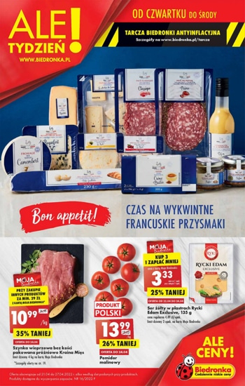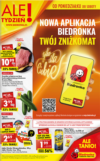 {loadposition linkBiedronka2} 'Ale tydzień!' - nowa gazetka promocyjna sieci sklepów Biedronka. Polecane promocje z gazetki sieci Biedronka: Kaczka świeża bez podrobów 1 kg - 11,99 zł*. Szynka wieprzowa bez kości pakowana próżniowo Kraina Mięs 1 kg - 11,99 zł*.…