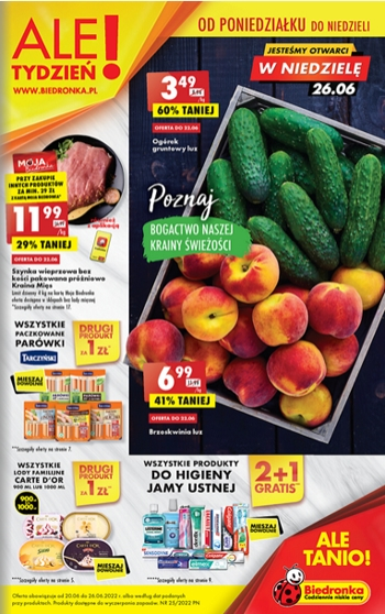 {loadposition linkBiedronka1} 'Ale tydzień!' - nowa gazetka promocyjna sieci sklepów Biedronka. Polecane promocje z gazetki sieci Biedronka: Ogórek gruntowy 1 kg - 3,49 zł*. Brzoskwinie 1 kg - 6,99 zł*. Szynka wieprzowa bez kości pakowana próżniowo Kraina Mięs 1…
