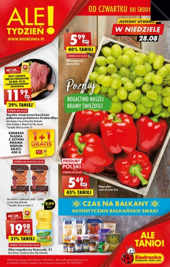 {loadposition linkBiedronka2} 'Ale tydzień!' - nowa gazetka promocyjna sieci sklepów Biedronka. Polecane promocje z gazetki sieci Biedronka: Winogrono jasne 1 kg - 5,99 zł*. Papryka czerwona 1 kg - 5,49 zł*. Szynka wieprzowa bez kości pakowana próżniowo Kraina Mięs…