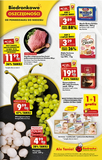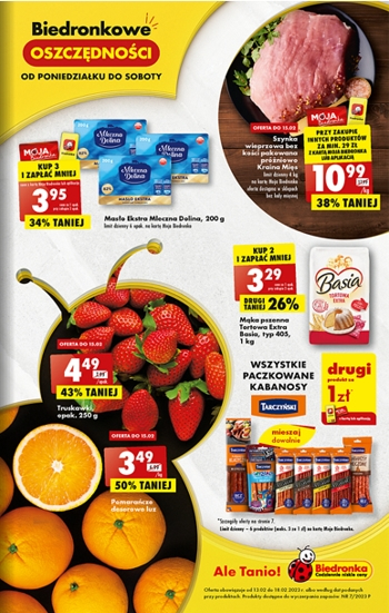 {loadposition linkBiedronka1} 'Biedronkowe oszczędności od poniedziałku do soboty' - nowa gazetka promocyjna sieci sklepów Biedronka. Polecane promocje z gazetki sieci Biedronka: Masło Ekstra Polskie Mlekovita 200 g - 5,79 zł*. Szynka wieprzowa bez kości pakowana próżniowo Kraina Mięs 1…