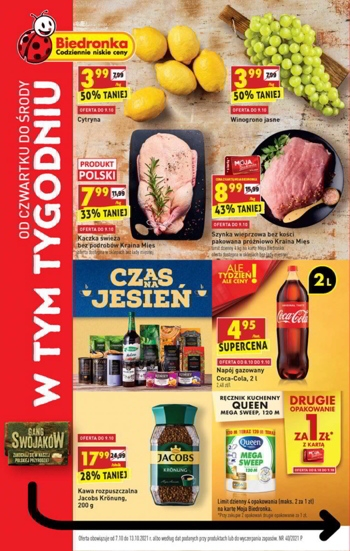 {loadposition linkBiedronka1} 'W tym tygodniu' - nowa gazetka promocyjna sieci sklepów Biedronka. Polecane promocje z gazetki sieci Biedronka: Winogrono różowe 1 kg - 6,99 zł. Banany premium 1 kg - 2,49 zł*. Szynka wieprzowa bez kości pakowana próżniowo Kraina…