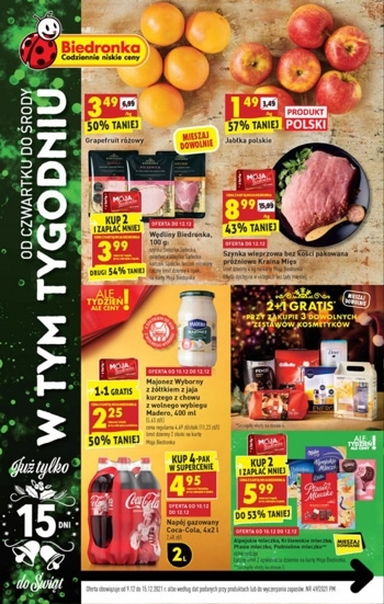 {loadposition linkBiedronka2} 'W tym tygodniu' - nowa gazetka promocyjna sieci sklepów Biedronka. Polecane promocje z gazetki sieci Biedronka: Grapefruit różowy 1 kg - 3,49 zł. Jabłka polskie 1 kg - 1,49 zł. Szynka wieprzowa bez kości pakowana próżniowo Kraina…