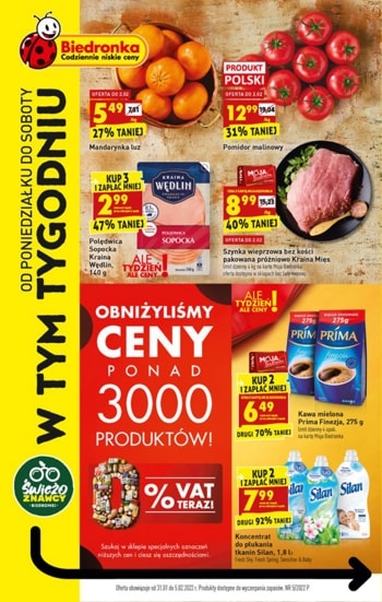 {loadposition linkBiedronka1} 'W tym tygodniu' - nowa gazetka promocyjna sieci sklepów Biedronka. Polecane promocje z gazetki sieci Biedronka: Mandarynki 1 kg - 5,49 zł. Pomidory malinowe 1 kg - 12,99 zł. Szynka wieprzowa bez kości pakowana próżniowo Kraina Mięs…