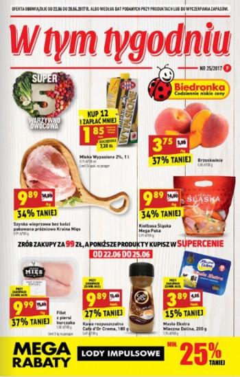 {loadposition linkBiedronka} Nowa gazetka promocyjna sieci handlowej Biedronka - "W tym tygodniu". Polecane promocje z gazetki sieci Biedronka: Brzoskwinie 1 kg - 3,75 zł. Szynka wieprzowa bez kości pakowana próżniowo Kraina Mięs 1 kg - 9,89 zł. Kiełbasa…