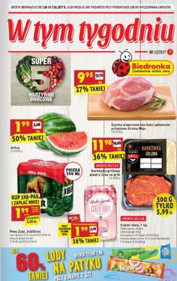 {loadposition linkBiedronka} Nowa gazetka promocyjna sieci handlowej Biedronka - "W tym tygodniu". Polecane promocje z gazetki sieci Biedronka: Szynka wieprzowa bez kości pakowana próżniowo Kraina Mięs 1 kg - 9,95 zł. Arbuz 1 kg - 1,99 zł.…