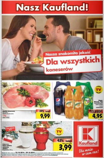 {loadposition linkKaufland} Nowa gazetka promocyjna marketu Kaufland - "Nasza znakomita jakość dla wszystkich koneserów". Polecane promocje z gazetki Kaufland: Szynka wieprzowa bez kości 1 kg - 9,99 zł. Pepsi, Mirinda lub 7Up 2x2 L - 4,95 zł. Znicz…
