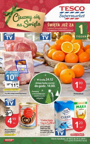 Nowa gazetka promocyjna Tesco - "Cieszmy się na święta". Polecane promocje z gazetki Tesco: Szynka wieprzowa bez kości 1 kg - 11,99 zł. Pomarańcze 1 kg - 1,99 zł. Masa makowa Tesco 850 g - 4,99 zł. …