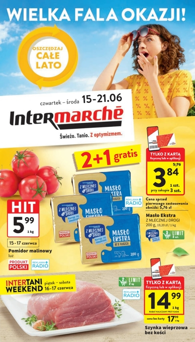 {loadposition linkIntermarche} 'Wielka fala okazji. Oszczędzaj całe lato' - nowa gazetka promocyjna sieci sklepów Intermarche Polecane promocje z gazetki Intermarche: Pomidory malinowe kg - 5,99 zł*. Masło ekstra Z mlecznej drogi 200 g - 3,84 zł**. Szynka wieprzowa bez…