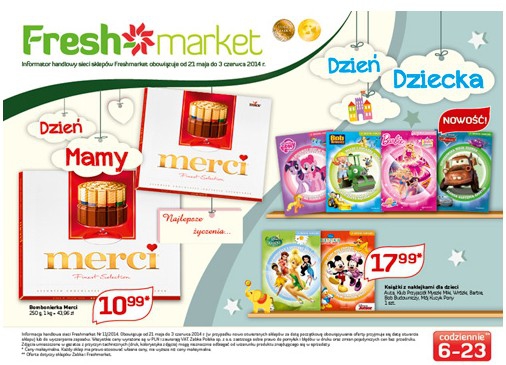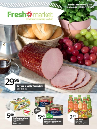 {loadposition linkFreshmarket} Nowa gazetka promocyjna Freshmarket. Polecane promocje z gazetki Freshmarket: Szynka z kotła Tarczyński 1 kg - 29,99 zł. Jaja Farmio z wolnego wybiegu 8 sztuk - 5,99 zł. Konserwa Krakus 300 g - 5,49 zł. Oferta…