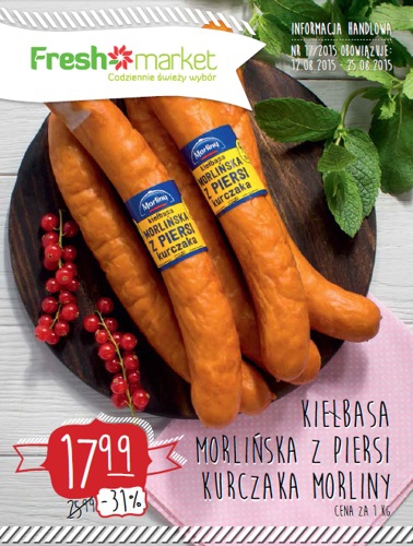 {loadposition linkFreshmarket} Nowa gazetka promocyjna Freshmarket. Polecane promocje z gazetki Freshmarket: Kiełbasa Morlińska z piersi kurczaka Morliny 1 kg - 17,99 zł. Szynka z kotła Tarczyński 1 kg - 27,99 zł. Szynka gotowana Kraina Obfitości 1 kg - 15,99…