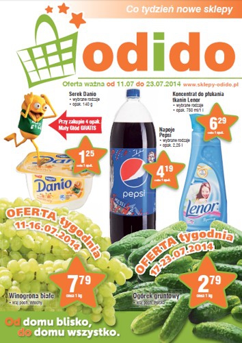 Nowa gazetka promocyjna sklepów Odido. Polecane promocje z gazetki Odido: Serek Danio 140 g - 1,25 zł. Koncentrat do płukania tkanin Lenor 1 L - 6,29 zł. Pepsi 2,25 L - 4,19 zł. Oferta ważna od 11.07…