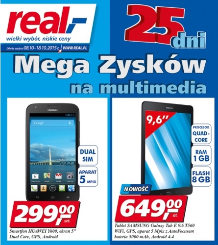 Nowa gazetka promocyjna sieci handlowej Real - "25 dni Mega Zysków na multimedia". Polecane promocje z gazetki Real: Smartfon Huawei Y600 - 299 zł. Tablet Samsung Galaxy Tab E - 649 zł. Smartfon Manta MSP4506 - 189 zł.…