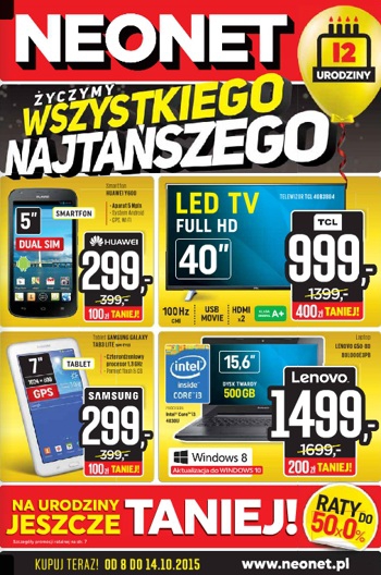 {loadposition linkNeonet} Nowa gazetka promocyjna Neonet - "Życzymy wszystkiego najtańszego". Polecane promocje z gazetki Neonet: Telewizor LED 40" TCL 40B3804 - 999 zł. Smartfon Huawei Y600 - 299 zł. Tablet Samsung Galaxy Tab 3 Lite - 299 zł. …