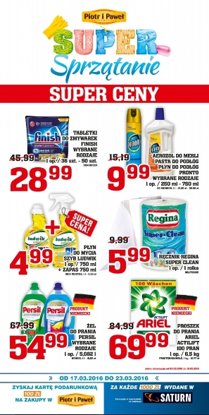 Nowa gazetka promocyjna sieci sklepów Piotr i Paweł - "Super sprzątanie". Polecane promocje z gazetki Piotr i Paweł: Tabletki do zmywarki Finish 50 sztuk - 28,99 zł. Aerozol do mebli Pronto 250 ml - 9,99 zł. Ręcznik Regina…