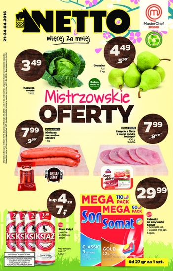 {loadposition linkNetto} Nowa gazetka promocyjna Netto - "Mistrzowskie oferty". Polecane promocje z gazetki Netto: Tabletki do zmywarki Somat Gold 60 sztuk - 29,99 zł. Piwo Książ 4x500 ml - 7 zł. Gruszki 1 kg - 4,49 zł. Oferta…