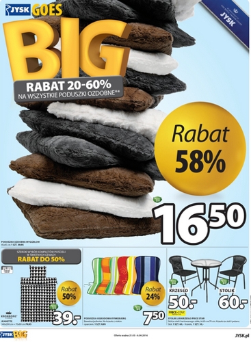 Nowa gazetka promocyjna JYSK. Polecane promocje z gazetki Jysk: Rabat 20-60% na wszystkie poduszki ozdobne. Rabat 30-50% na wszystkie komplety pościeli dziecięcej. Rabat 20-70% na wszystkie tekstylia do jadalni. Oferta ważna od 21.03 do 6.04.