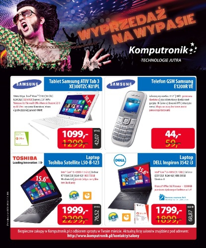 {loadposition linkKomputronik} Nowa gazetka promocyjna Komputronik - "Wyprzedaż na wypasie". Polecane promocje z gazetki Komputronik: Tablet Samsung ATIV Tab 3 - 1099 zł. Telefon komórkowy Samsung E1200R VE - 44 zł. Laptop Toshiba Satellite L50-B-123 - 899 zł. …