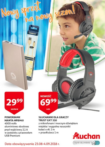 {loadposition linkAuchan} 'Nowy sprzęt na nowy sezon!' - nowa gazetka promocyjna sieci marketów Auchan. Polecane promocje z gazetki Auchan: Powerbank Manta MPB940 - 29,99 zł. Słuchawki dla graczy Trust GXT 310 - 69,99 zł. Telefon komórkowy Manta TEL1711 -…