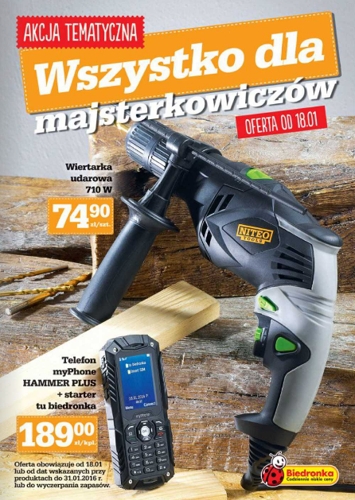 {loadposition linkBiedronka} Nowa gazetka promocyjna sieci handlowej Biedronka - "Wszystko dla majsterkowiczów". Polecane promocje z gazetki sieci Biedronka: Wiertarka udarowa 710 W - 74,90 zł. Telefon myPhone Hammer Plus + starter Tu Biedronka - 189 zł. Pilarka tarczowa -…