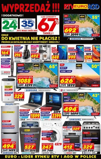 'Wyprzedaż i dodatkowo drugi produkt 24% taniej lub trzeci 35% taniej lub czwarty 67% taniej oraz do kwietnia nie płacisz! Promocja ratalna na cały asortyment!' - nowa gazetka promocyjna RTV EURO AGD. Polecane promocje z gazetki RTV EURO AGD:…