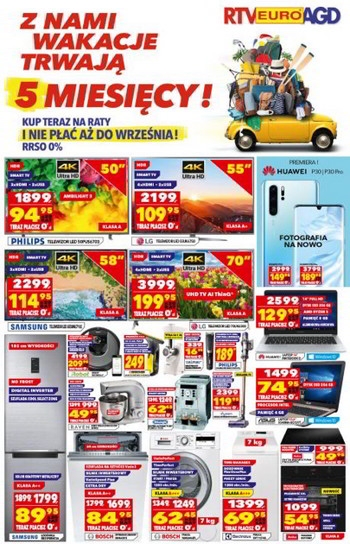 'Z nami wakacje trwają 5 miesięcy' - nowa gazetka promocyjna RTV EURO AGD. Polecane promocje z gazetki RTV EURO AGD: Telewizor 4K Ultra HD 50 cali Philips 50PUS6703/12 - 1899 zł. Smartfon Huawei P30 Opal - 2999 zł. Odkurzacz automatyczny…