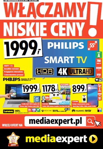 {loadposition linkMediaExpert} 'Włączamy niskie ceny!' - nowa gazetka promocyjna sieci sklepów Media Expert. Polecane promocje z gazetki Media Expert: Telewizor 4K Ultra HD 55 cali PHILIPS 55PUS6523/12 - 1999 zł. Laptop ASUS Vivobook A510UA-EJ1557T - 2799 zł. Smartfon HUAWEI…